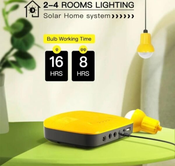Portable solar lighting kit with 4 bright LED bulbs, 8W panel, and 12,000mAh battery. Lights up to 4 rooms for up to 16 hours-ideal for off-grid use and power outages.