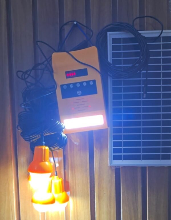 This Solar Rechargeable Lighting System is a complete solution for off-grid homes, shops, and emergency lighting. It features 4 bright LED bulbs with individual on/off switches, a built-in wall light, and a long-lasting lithium battery. Perfect for rural areas and places with unstable electricity.