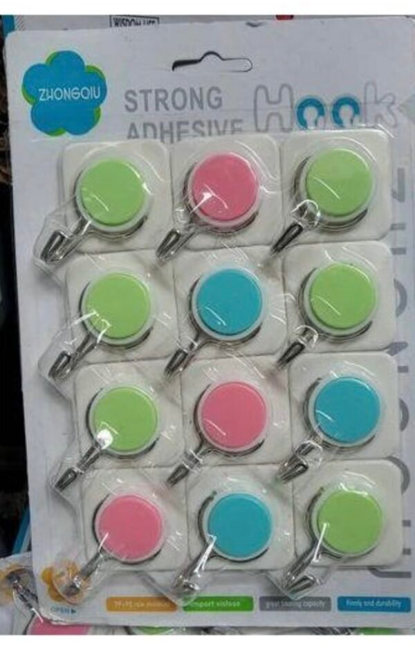 This item is our economic self-adhesive hook, comes with 12 pieces, it’s made of high quality PVC and stainless steel, including the strong glue, the size is compact to save space when you stick it on the bathroom wall, kitchen wall, even the door or furniture, it can perform well on the different surface, not only the ordinary wall surface, but also glass surface, metal surface, tile surface, marble surface, etc., the strong glue makes it can bear much heavier objects, such as cookware, gadgets, bottle water and so on.